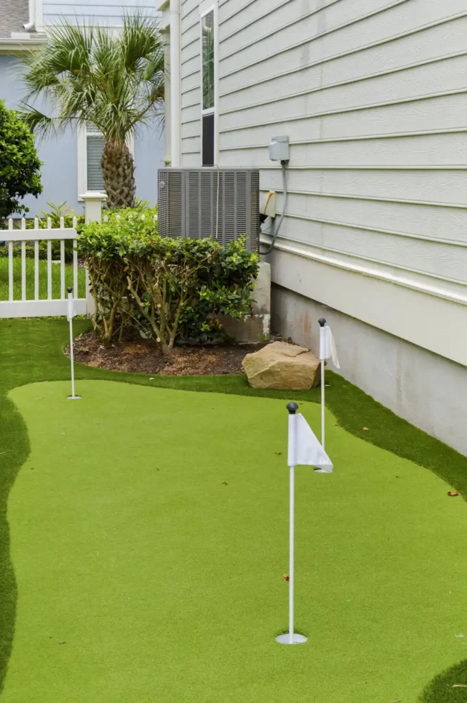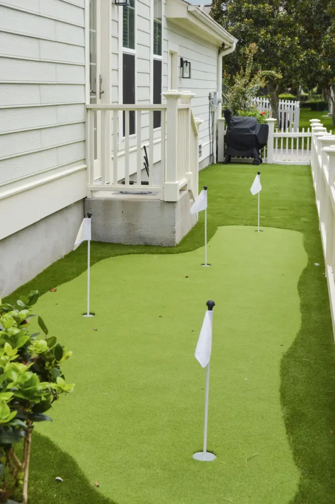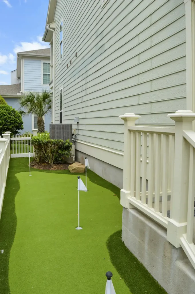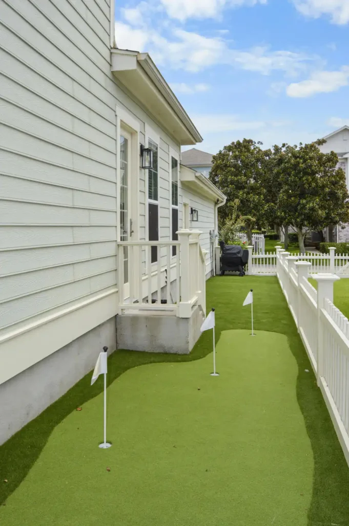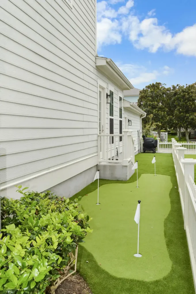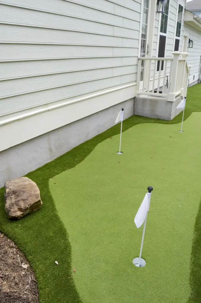 This backyard was designed to combine recreation with everyday function in a clean, low-maintenance layout. A four-hole putting green creates a central feature, surrounded by turf for a seamless, natural look. A metal border defines the turf with precision, while a new concrete pad was poured to provide the perfect space for the client’s grill. To improve access and flow, an additional concrete stair was installed, tying the design together with practical detail. The result is a backyard that balances leisure, durability, and purposeful design.
