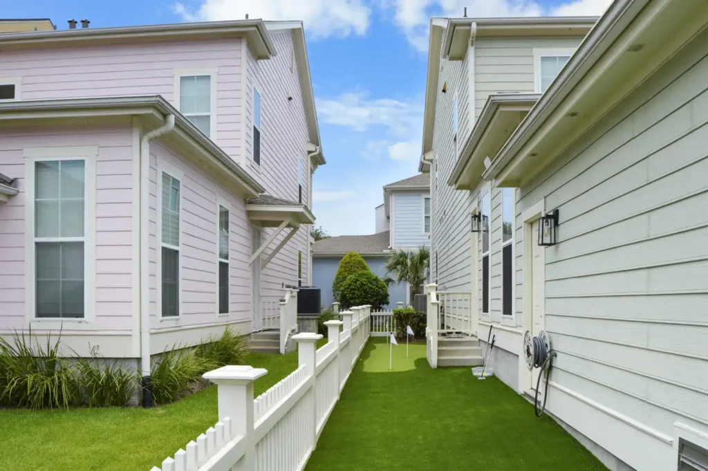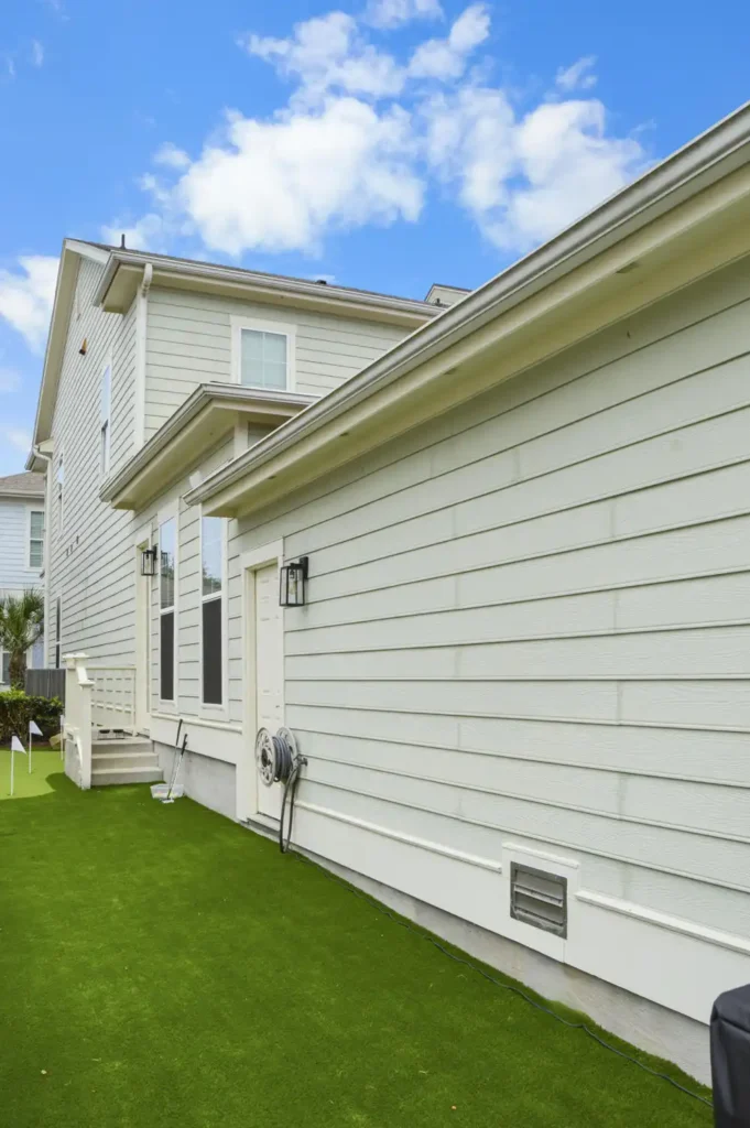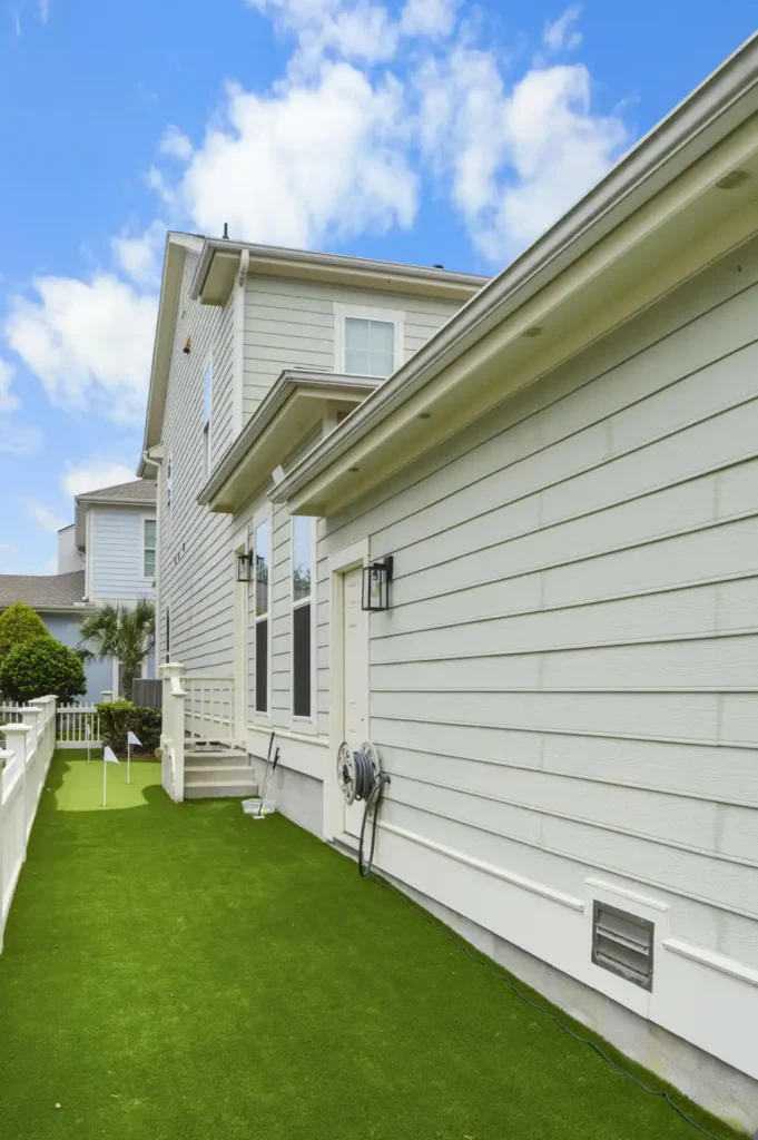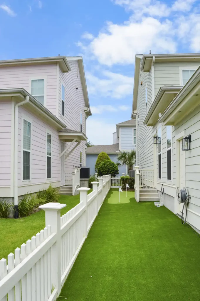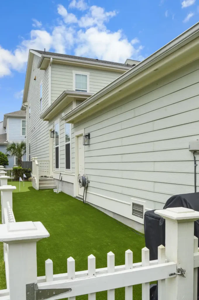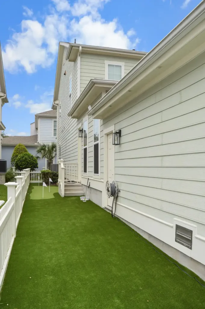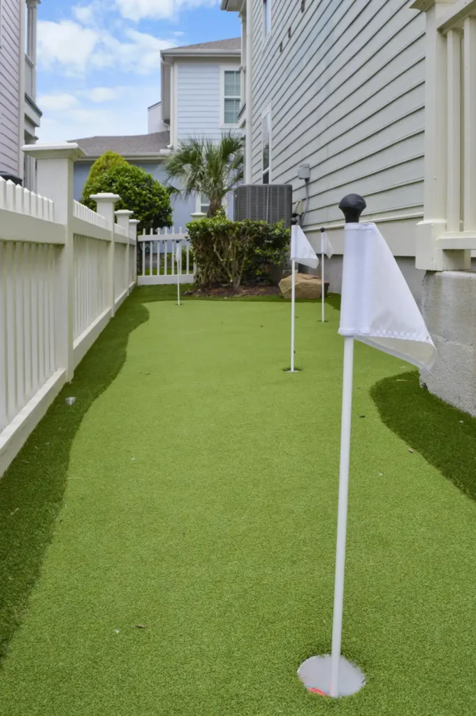 This backyard was designed to combine recreation with everyday function in a clean, low-maintenance layout. A four-hole putting green creates a central feature, surrounded by turf for a seamless, natural look. A metal border defines the turf with precision, while a new concrete pad was poured to provide the perfect space for the client’s grill. To improve access and flow, an additional concrete stair was installed, tying the design together with practical detail. The result is a backyard that balances leisure, durability, and purposeful design.