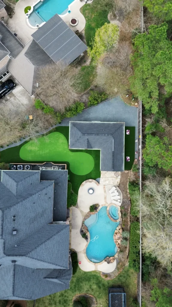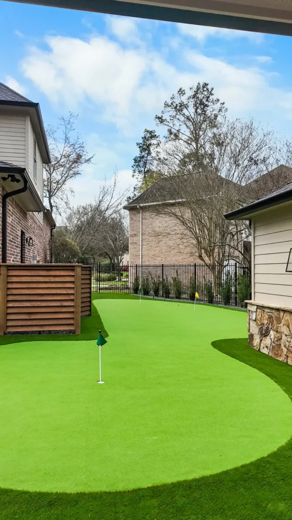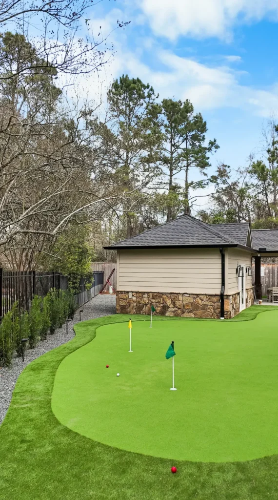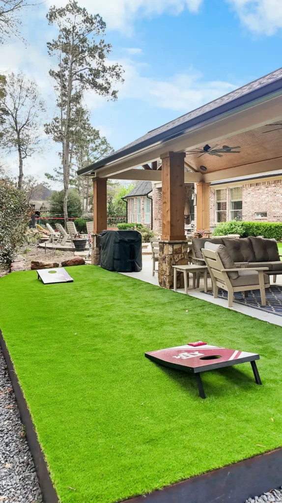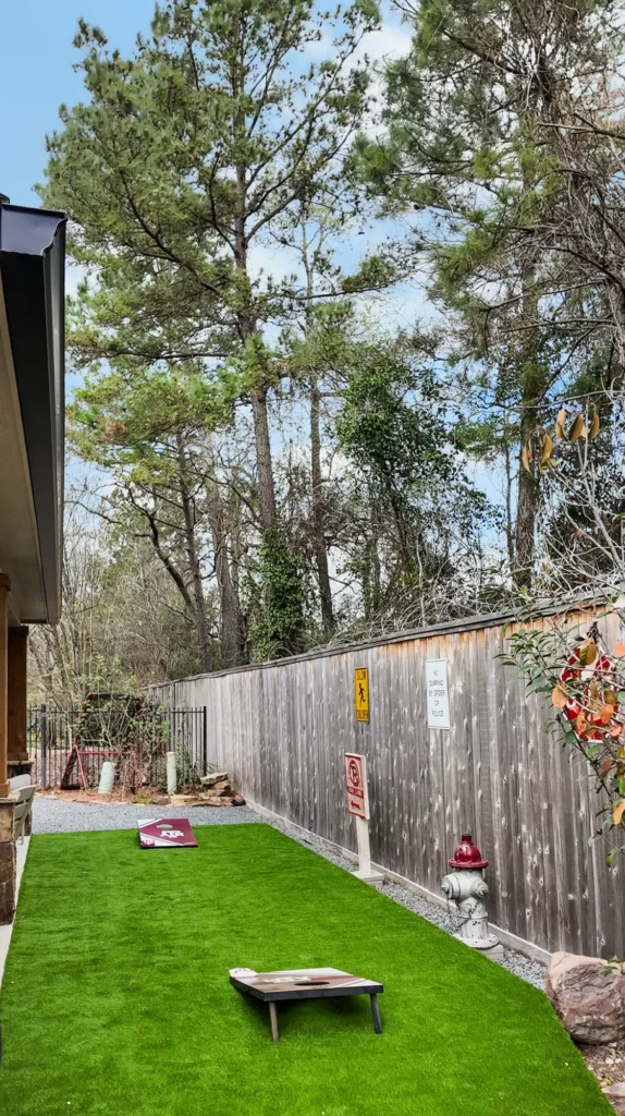 This backyard project features approximately 1,753 square feet of artificial turf installed on a compacted decomposed granite base and graded for proper drainage to the existing catch basin. Clean raw steel metal edging defines the turf areas and retains surrounding materials for a crisp, modern finish. The project also included drainage improvements, tying in existing downspouts and extending the system to a pop-up emitter at the property line. Japanese Yews along the property line and a black star gravel bed with metal edging complete the space, adding contrast, structure, and a low-maintenance landscape design.